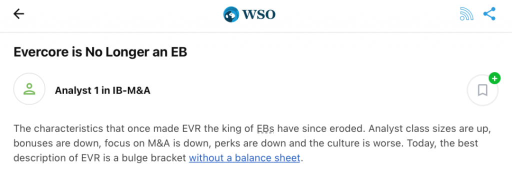 其中,Evercore作为精品投行的老大,因为名气和规模变大,开始越来越像九大投行,在WSO上被戏称为“没有资产负债表的九大投行”。但Evercore实际上仍然保留着精品投行的种种优点。