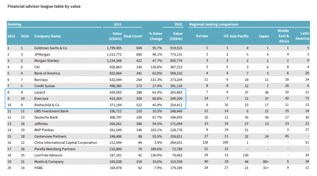 以精品投行最擅长的并购咨询业务为例,2020和2021年的排名中,Lazard、Evercore和Rothschild三家精品投行的并购交易金额都已经超过了九大投行中的UBS和Deutsche Bank。