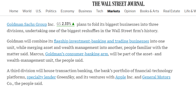 两天前,Wall Street Journal曝出高盛将对其几大主要业务部门进行重组。今天上午,高盛发布的三季度业绩报告,高盛CEO也在发布业绩时证实了这一报导。