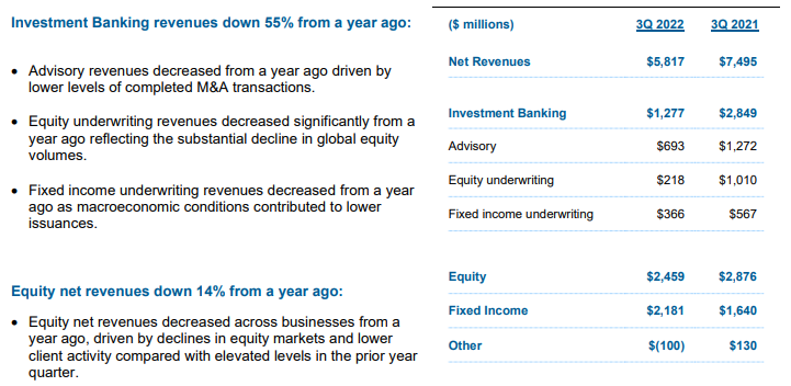 刚刚发布的三季报显示,高盛的营收确实出现了下滑,主要是因为投行业务的暴跌。从业绩数据来看,高盛的改组活动将业绩增长和下滑的部门组合在了一起,活像是小学班级里组成的“帮扶小组”。