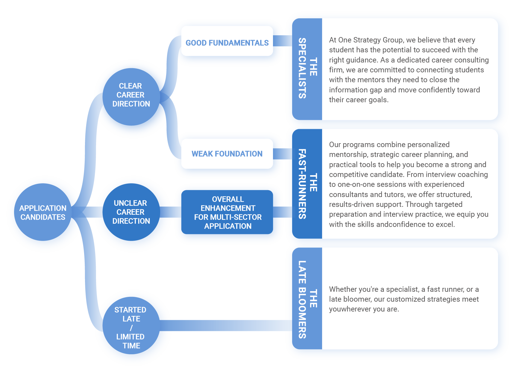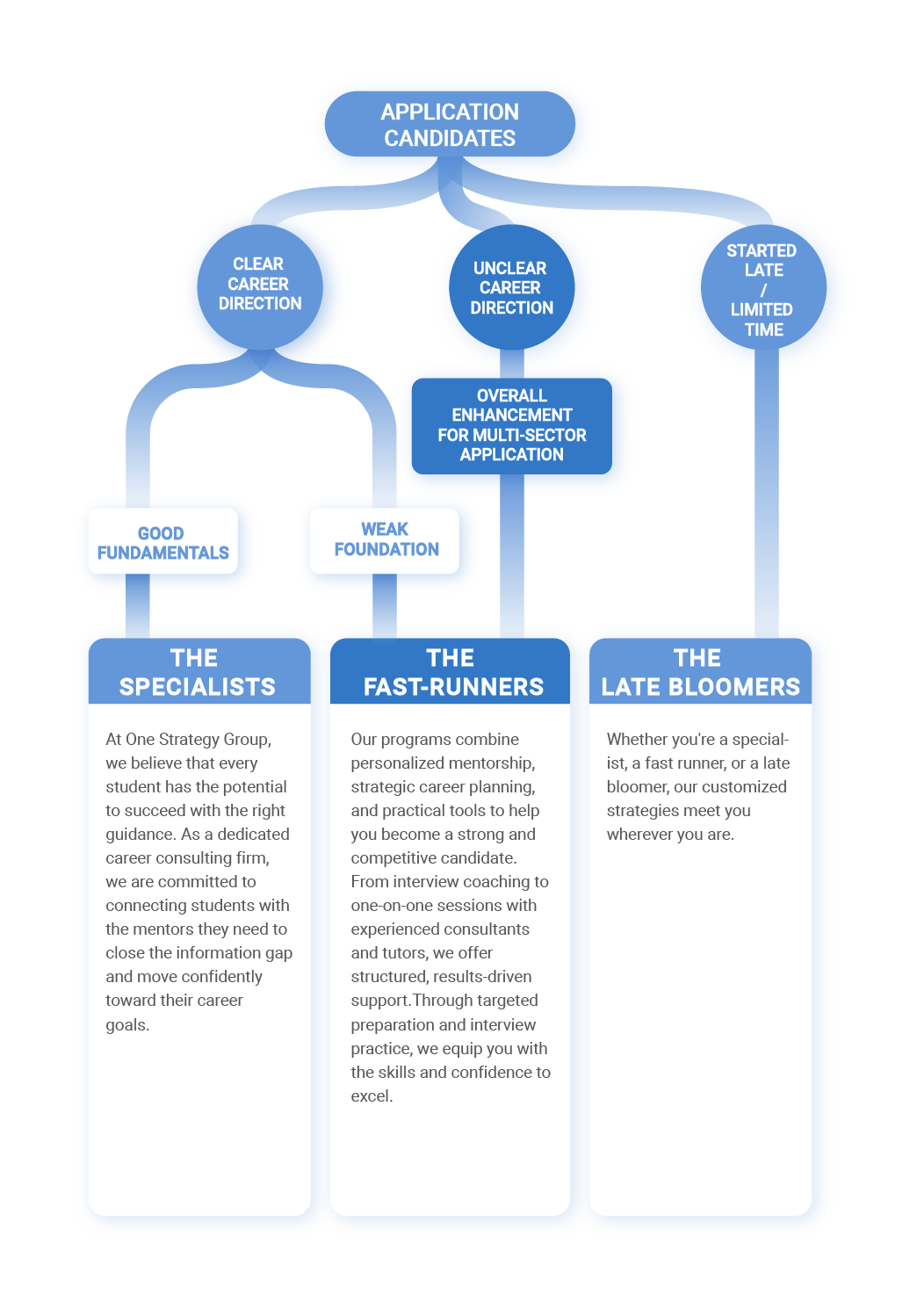 Don’t let fear or uncertainty hold you back. At One Strategy Group, we believe every student can succeed with the right guidance. Our mentors are here to provide clarity, bridge the information gap, and guide you toward the best path forward. With tailored strategies like The Specialists, The FastRunners, and The Late Bloomers, we meet you where you are, whether you’re building on a strong foundation or starting from scratch. Our programs offer personalized mentorship, strategic career planning, and all the tools you need to become a competitive candidate.